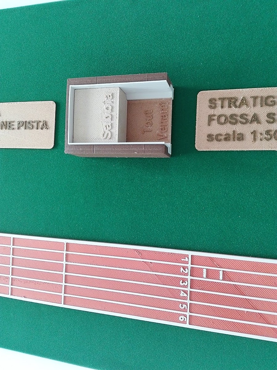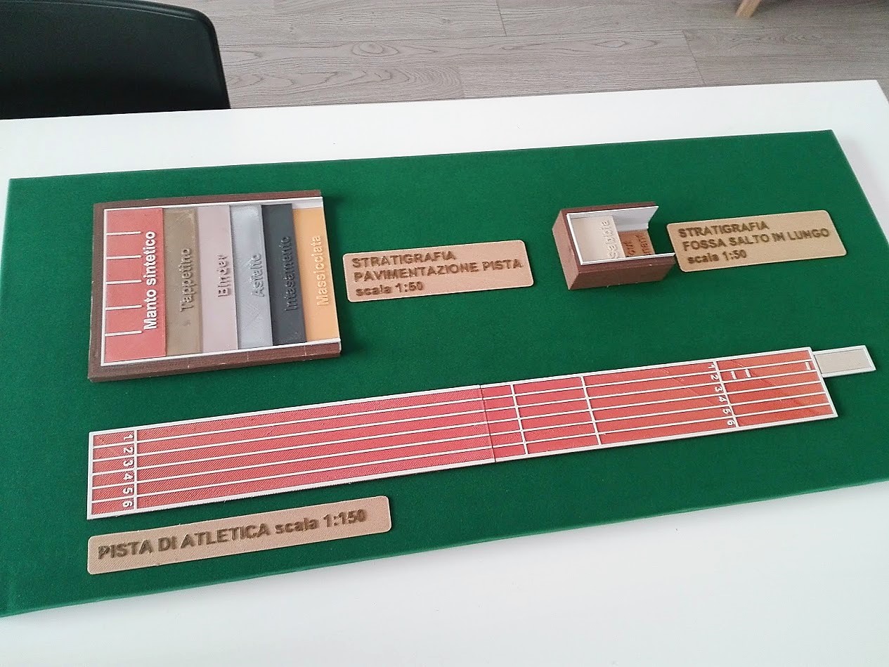 Inoltre, sono stati realizzati due blocchi focus, in scala maggiorata rispetto al plastico (1:50), rappresentanti le due stratigrafie della Pista di Corsa e della Pista di Salto.